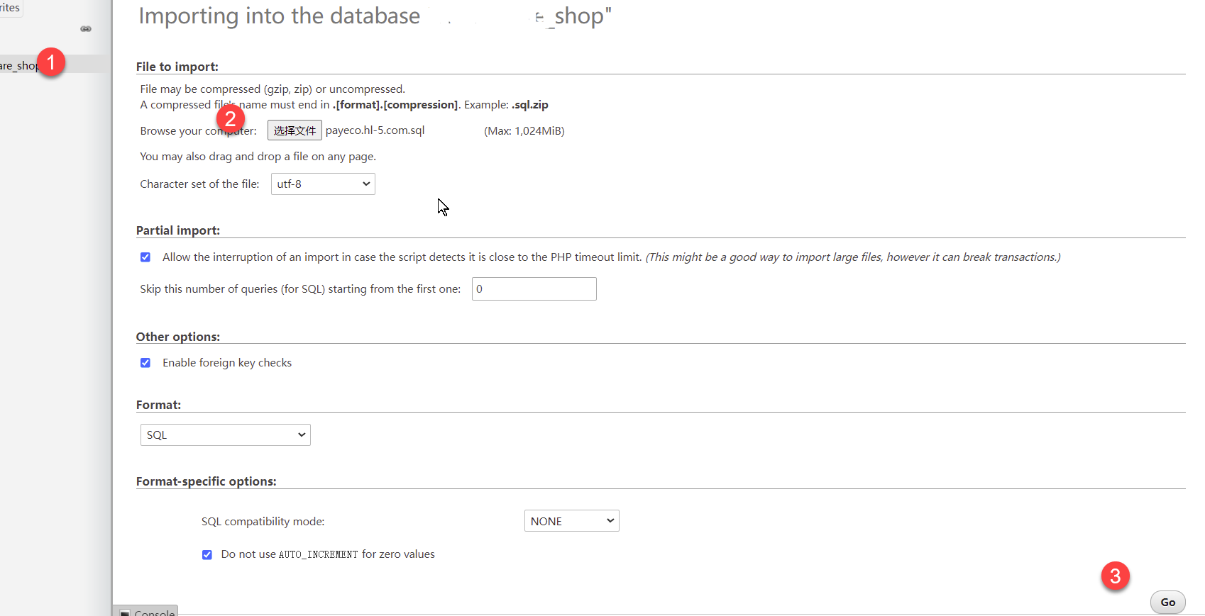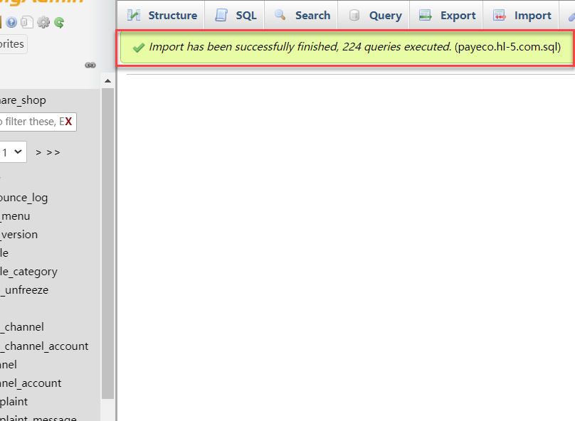 点击创建的数据库,然后点击import,打开本地的payeco.hl-5.com.sql文件,导入数据库