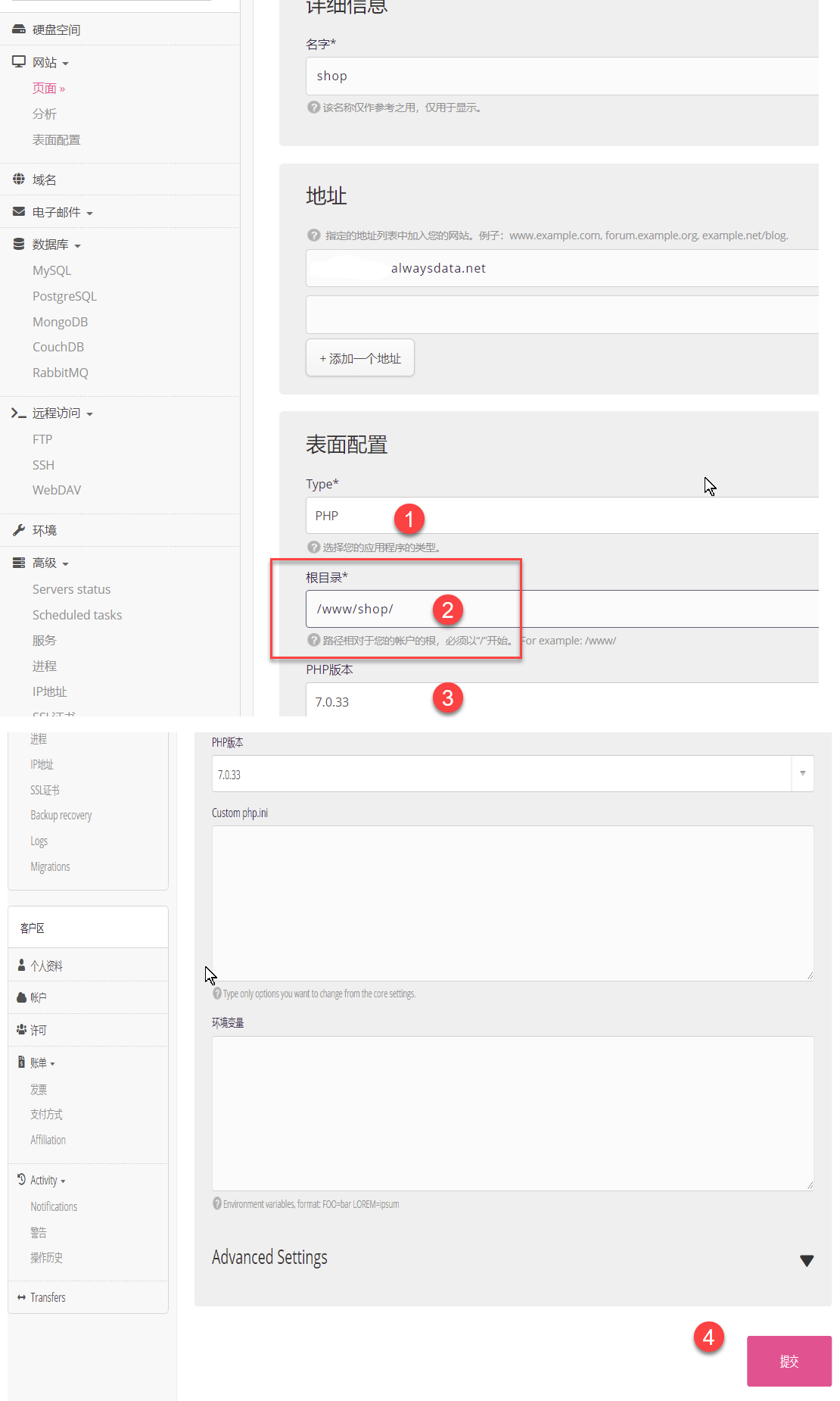 填写网站源代码在服务的地址,并选择PHP版本,推荐7.0